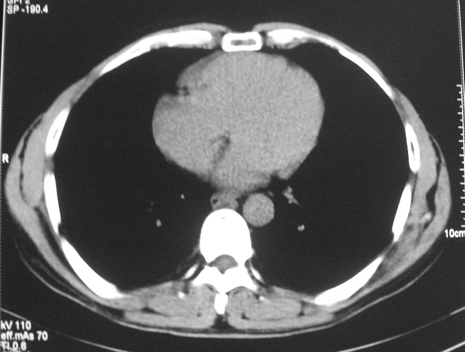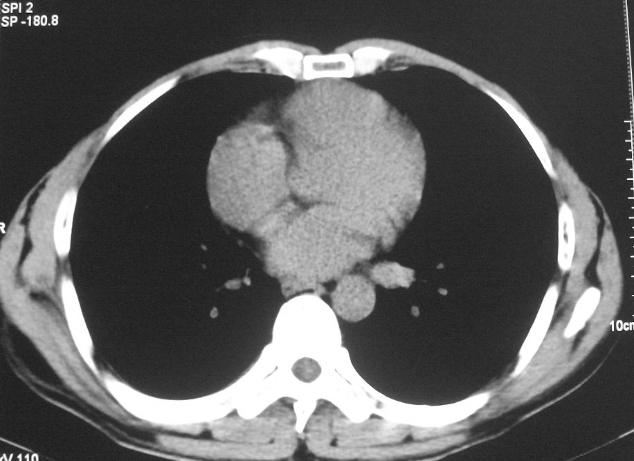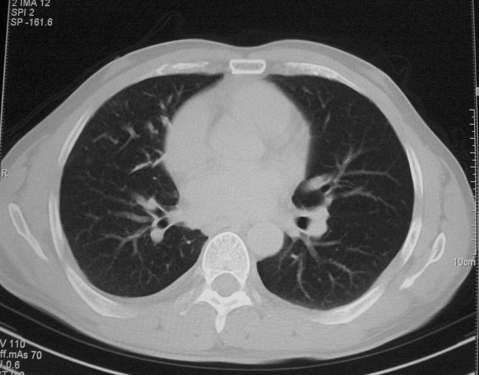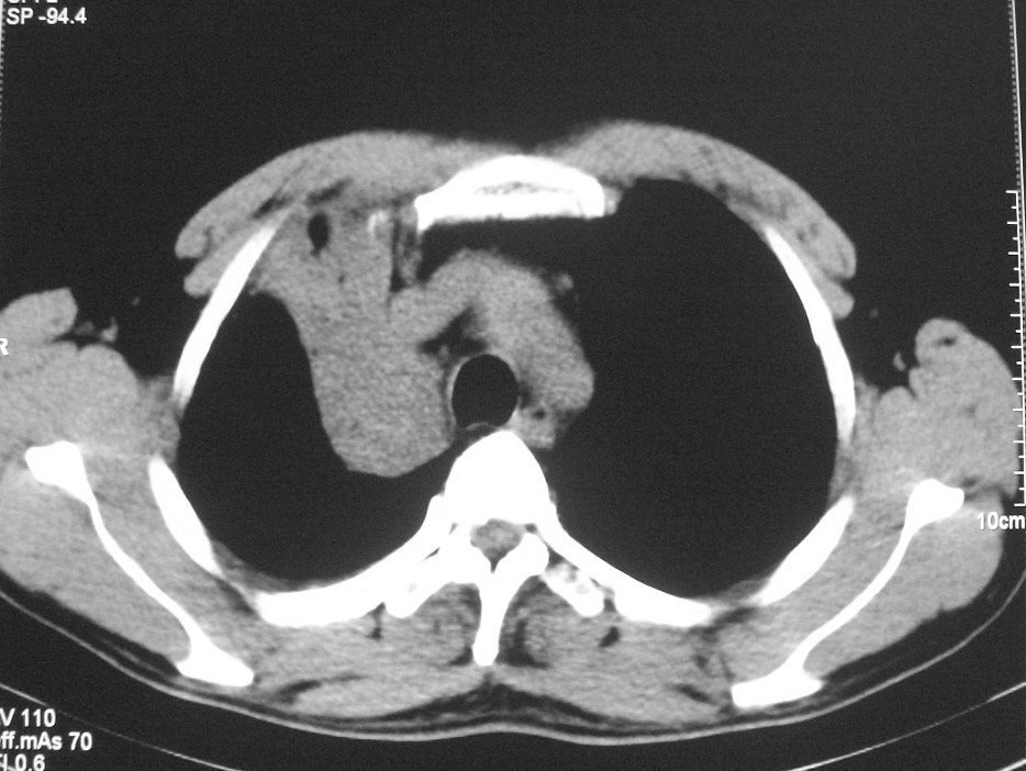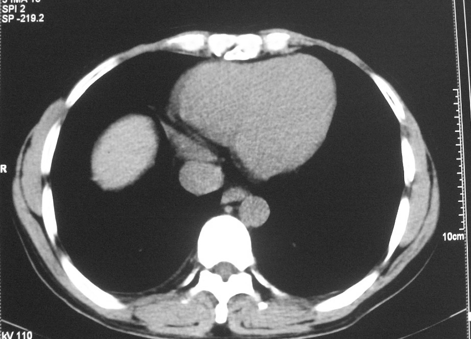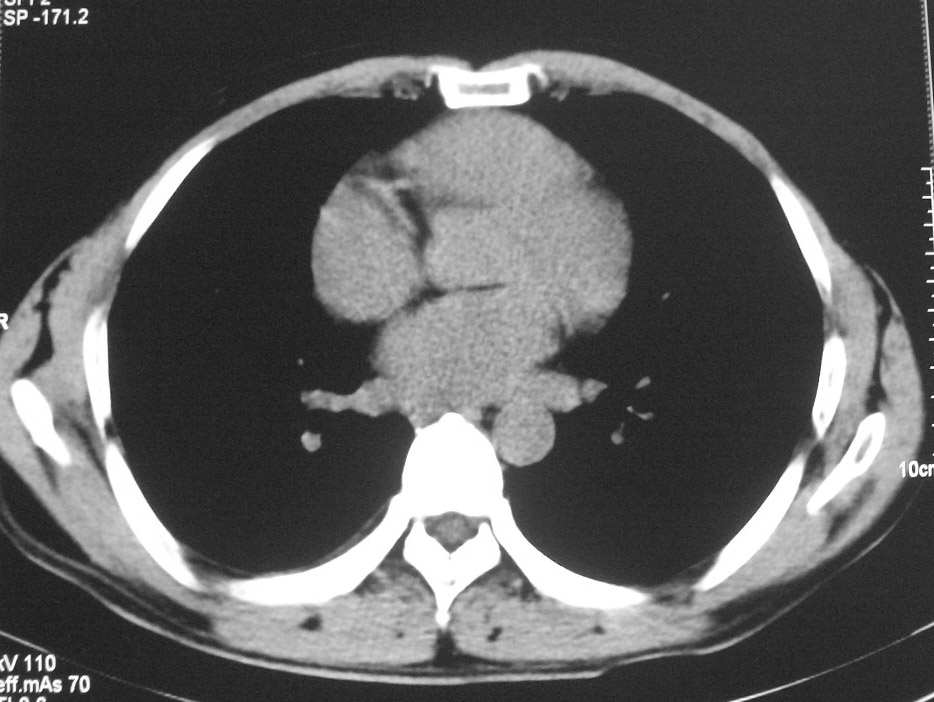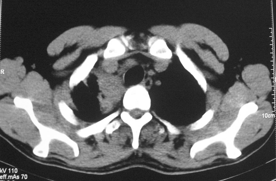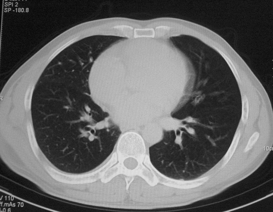 右肺上叶支气管后壁增厚,呈鼠尾状狭窄,纵隔内未见明显增大的淋巴结影,考虑为中央型肺癌伴右上肺不张