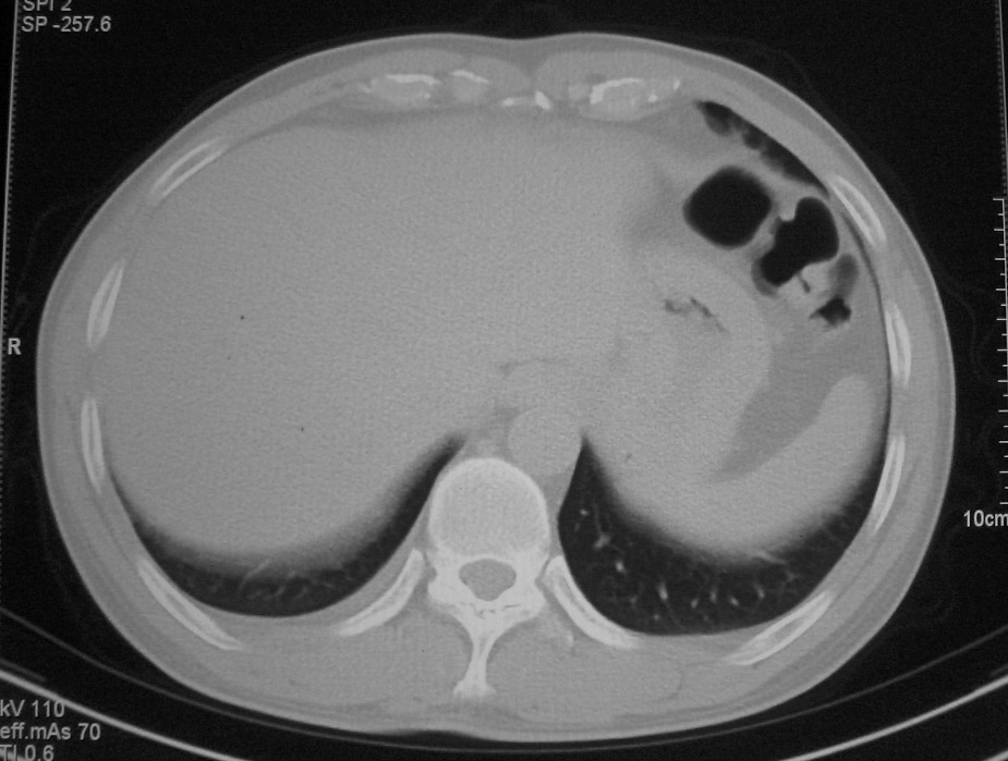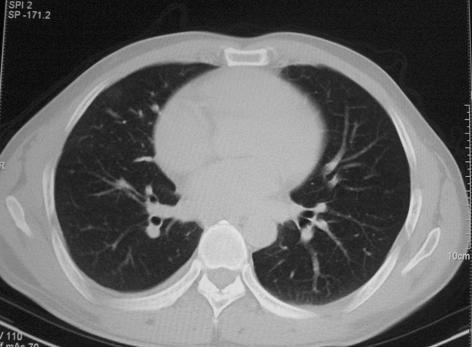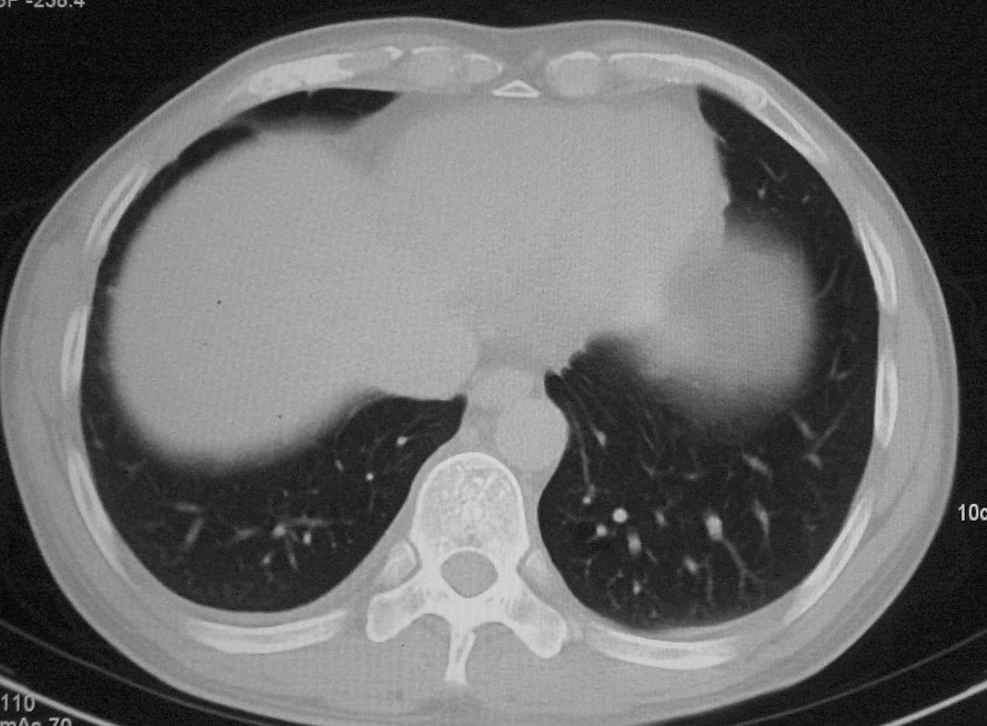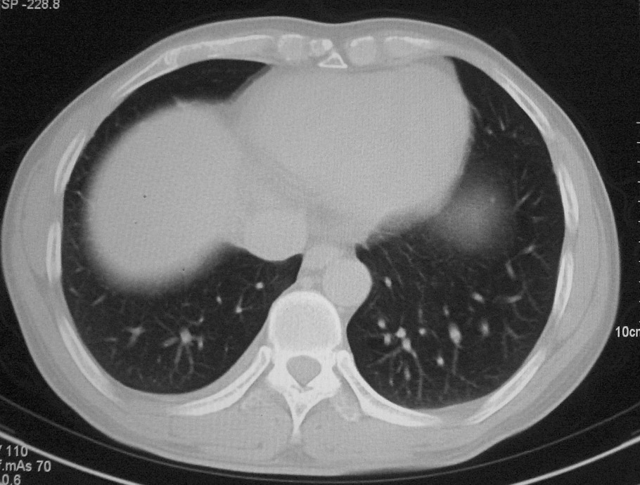 左肺上叶不张,左肺上叶支气管狭窄,呈鼠尾征,左侧胸腔内见少许积液,考虑左肺上叶中心型肺伴左侧胸腔内少许积液可能,不除外结核,建议支气管镜检查.