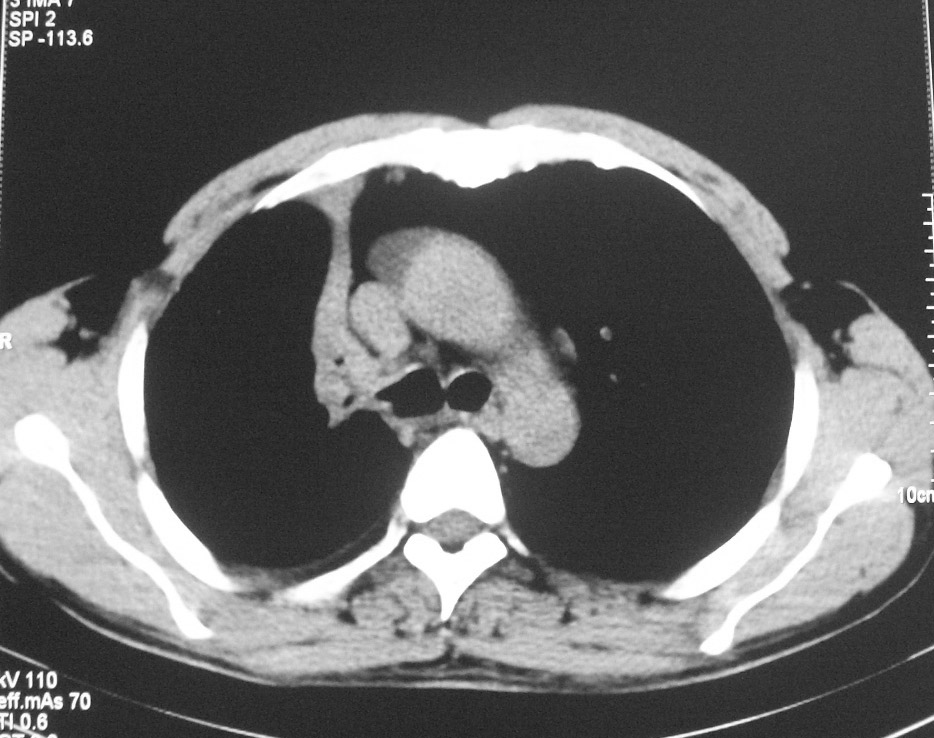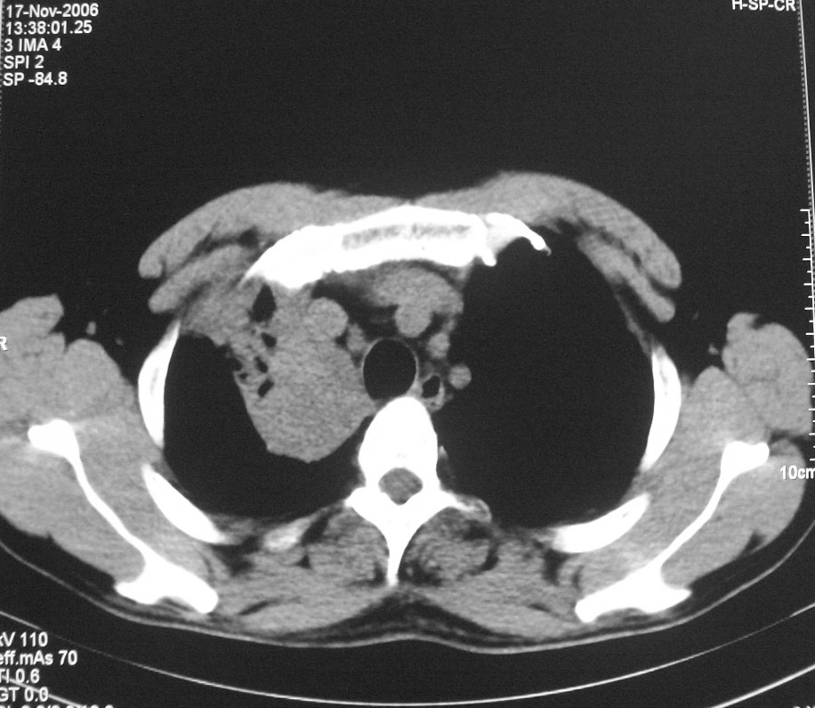 右肺上叶中央型肺癌并上叶肺不张、纵隔淋巴结肿大