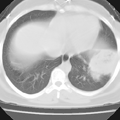 左下肺肿块影,内可以见小泡征,并见厚壁空洞形成,洞内缘凹凸不平,可见壁结节。靠近胸膜侧可见胸膜凹陷征。左侧胸腔内可见少量低密度积液影。双肺可见多发性小结节影。