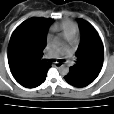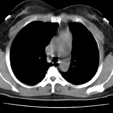 支持。另外,双侧腋下似见增大淋巴结影,有侧乳腺4、5点处皮下高密度结节影是什么?食管中下段有没有问题?病人比较年轻,因此诊断恶性肿瘤要慎重,多结合临床和其他检查,多考虑一些,也可短期抗炎治疗后复查。