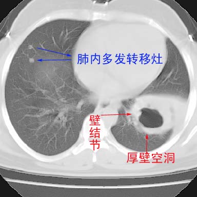 周围型空洞型肺癌伴肺转移。