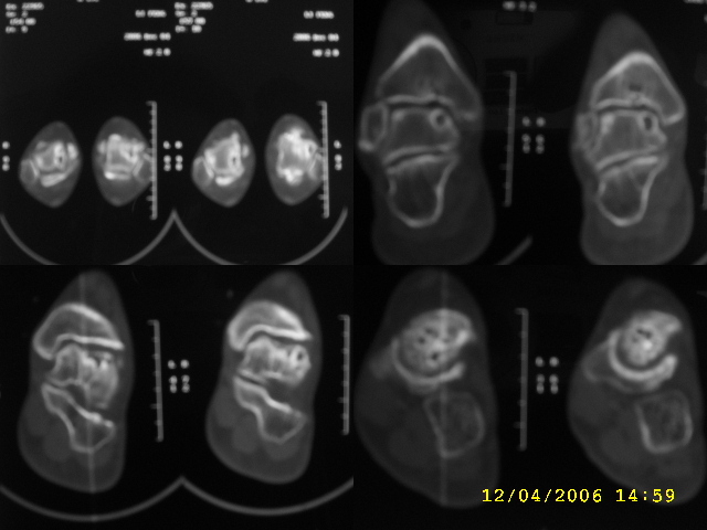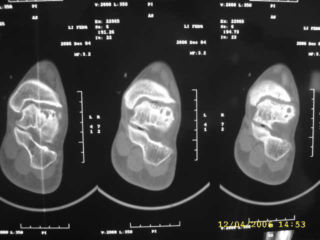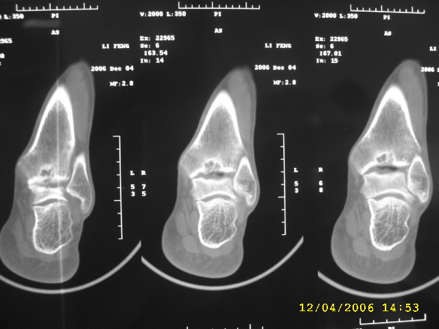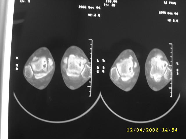 以下是引用拾荒者在2006-12-5 22:53:00的发言:[br]双侧距骨及胫骨都有骨质破坏,边缘硬化内可见更高密度影,双侧对称性发病,踝关节及跟距关节内低密度影(气体影?),双侧对称发病基本可以排除关节结核及化脓性关节炎,痛风性关节炎以第1跖趾关节为典型发病部位,临床症状间歇性发作,受累关节非对称性肿胀与本例不符,首先考虑退行性骨关节病,请结合抗\"o\"及类风湿因子检查排除风湿性关节炎。