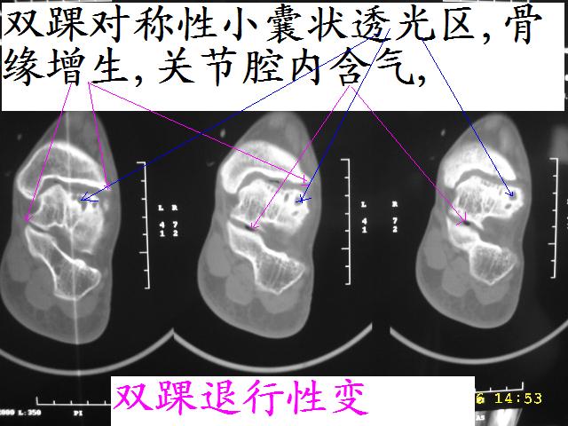 以下是引用迎客松abc在2006-12-6 12:46:00的发言:[br]双侧距骨可见多发囊变区,边缘硬化,关节腔内可见气化.双侧同时病变一般考虑全身性疾病可能性大,又发生在小关节所以首先考虑类风湿性关节炎,其次为退行性关节病.