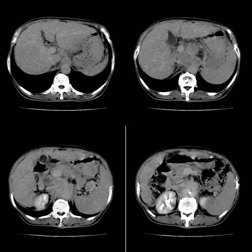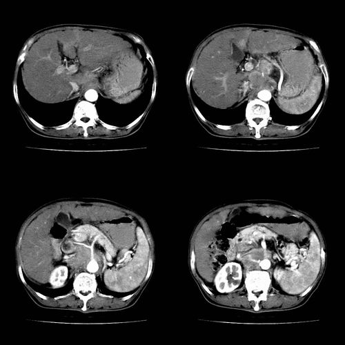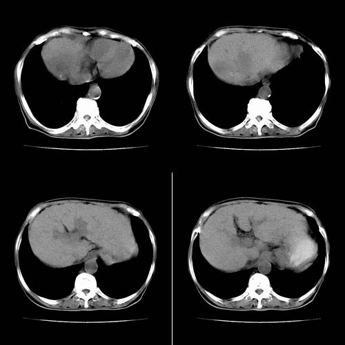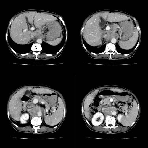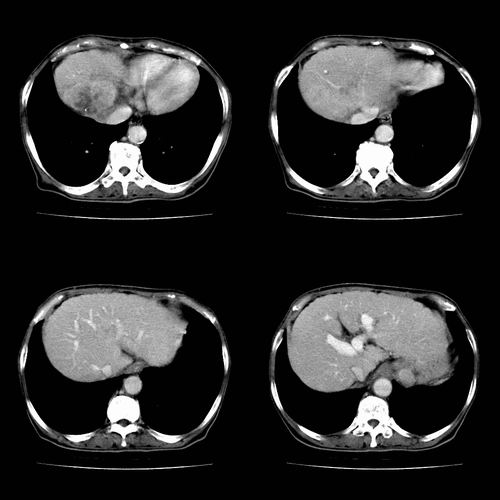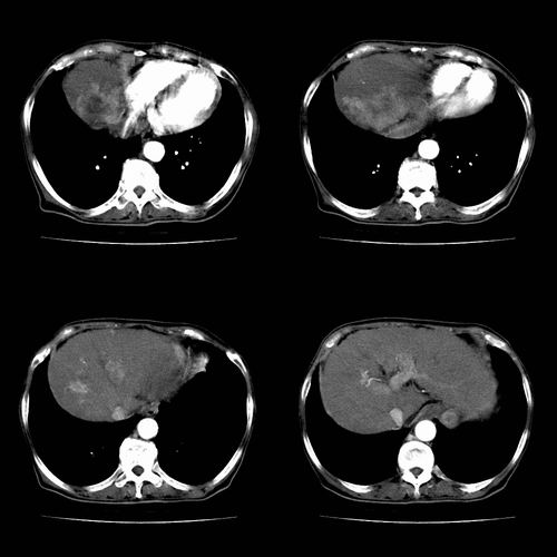患者 女性 58岁,家族有乙肝病史,(并姊妹中已有3人确诊肝癌,真是不幸!乙肝病毒真是害死人!)近期明显消瘦,乏力,右上腹疼痛.行ct结果非常典型,请诸位老师会诊!