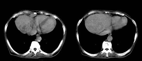 1、肝右叶肝癌,后腹膜淋巴结转移(包绕腹腔干及肠系膜上动脉,推压门静脉、下腔静脉及胰头)
