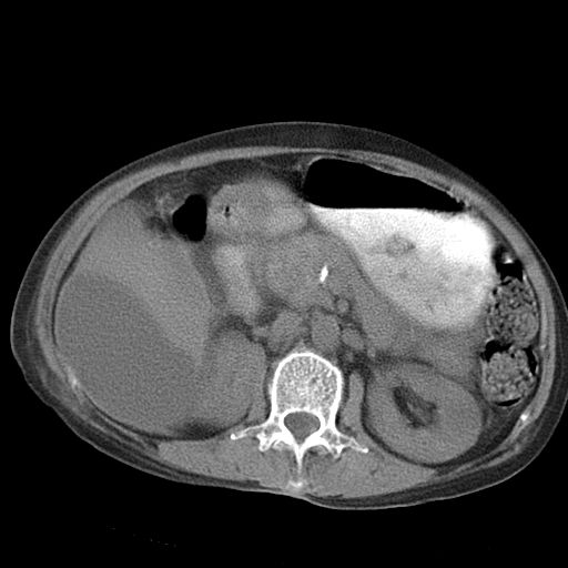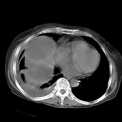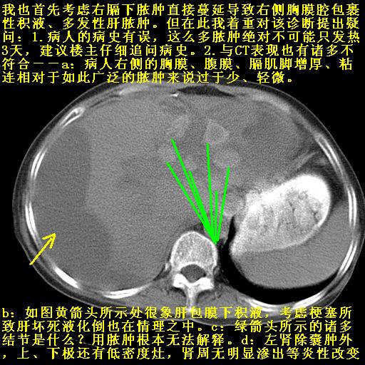 以下是引用jiazh在2006-12-7 20:37:00的发言:[br]肝脏周围半狐形低密度影,肝脏表面受压推移,考虑膈下脓肿可能性大;2、右侧胸腔积液