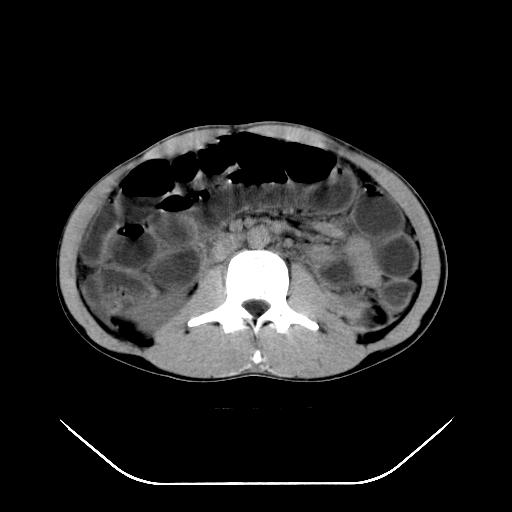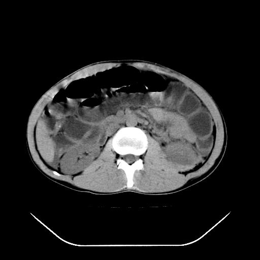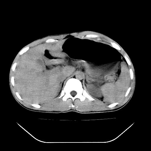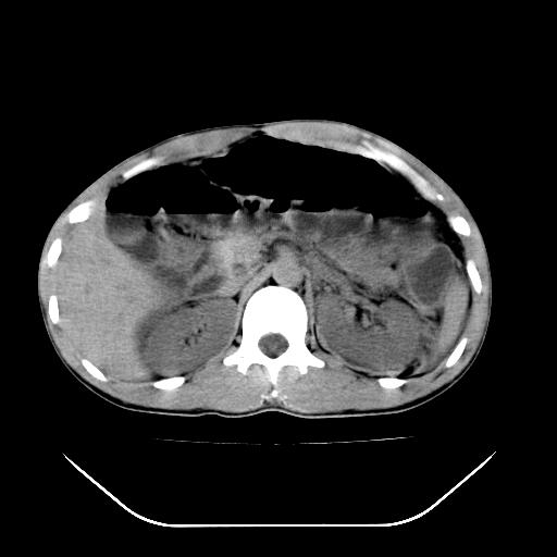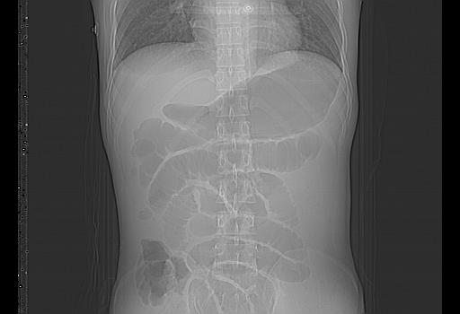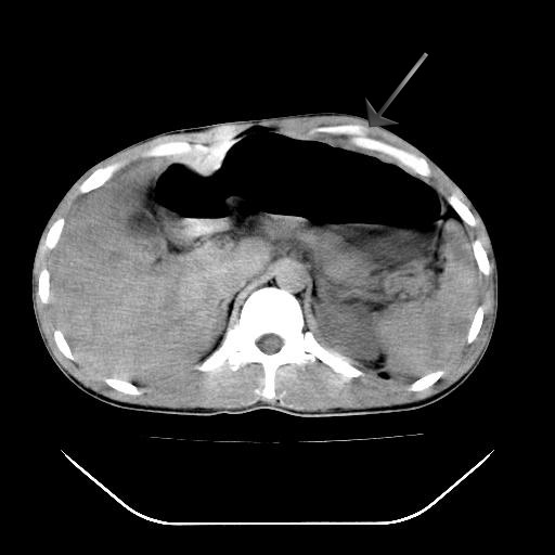 第二次ct检查后:临床医生腹水穿刺后考虑肠系膜动脉破裂,后实行剖腹探查:于空肠距离十二指肠90cm处发现肠管破裂,破裂口较小;修补后关腹。