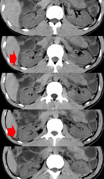 我不同意守望可西里老师所说的有输尿管的血液凝积一说,首先从这个图像来看输尿管的走行太偏外了,输尿管是肾盂向下延续的部分,开始在腰大肌的外缘,逐渐向内偏移,接近或越过腰椎横突的外端。而守望可可西里老师所指的这段图像位置太靠外了,且总是伴行在一段肠管的前缘。第二,如果有血液的凝积,可造成肾盂肾盏的扩张积水,而这个病人的肾盂肾盏的形态一直很好。