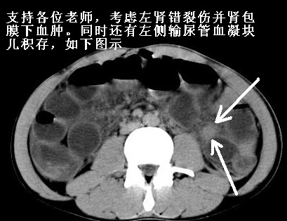 以下是引用zjzjr在2006-12-8 16:05:00的发言:[br]支持:1、左肾挫裂伤并肾周血肿;[br] 2、少量腹水;[br] 3、左肾旋转不良;[br] 4、反射性肠淤张。[br]左肾没有积水,输尿管位置应该靠内侧.所以守望可可西里老师所指左侧输尿管血凝块,连续看应该是肠管.[br]