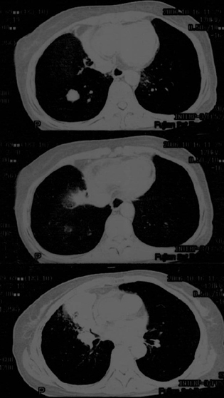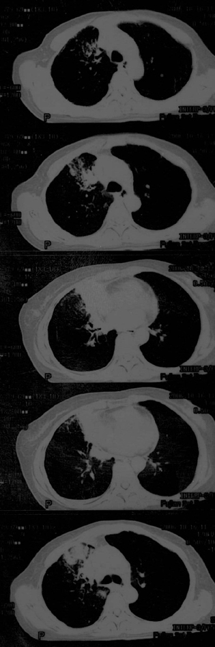 片子不清,右肺下叶像个结核球,右肺上叶需要做个支气管镜检查,除外中心型肺癌。个人意见,其他老师们再看看。