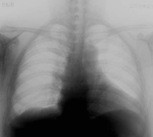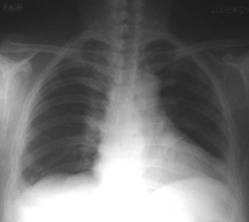 谢谢各位同行的指导!该病人是较胖的一个人,我用12x15胶片照的时候增感屏都是横起放的,要不是都照不起,当时我也考虑是心脏的重影,现在有各位的看法,也证实的我的这一点,因为停电,所以病人一照好以后便走了,所以没有照侧位,也没有机会透视看了。这一张片子我都是点着烟边抽边照边洗的。所以不怎么好看,呵呵!