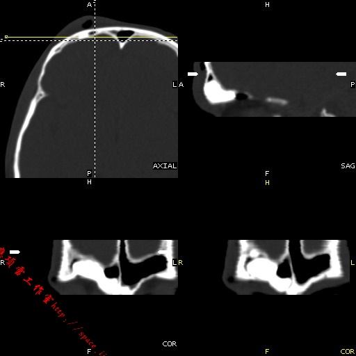 右额窦至密性骨瘤,右额骨皮下软组织挫伤拌积气.