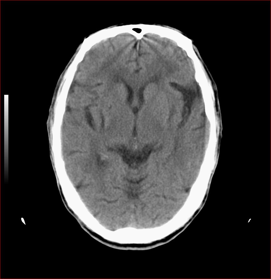 右侧基底节区斑片状低密度影,边缘模糊,结合临床考虑:1.右侧基底节区脑梗塞;2.老年性脑改变