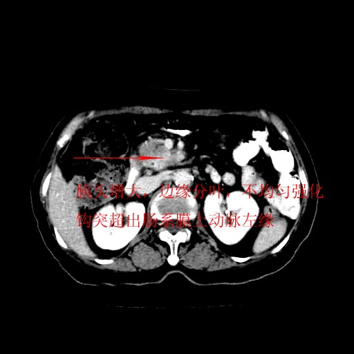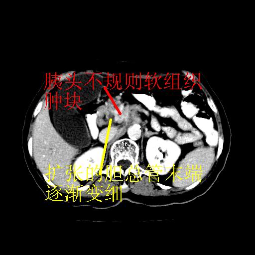 肝内外胆管增粗,梗阻点位于胰头部,胰头增大不均性明显强化,胰体尾部萎缩,胰管显影,虑为胰头ca.