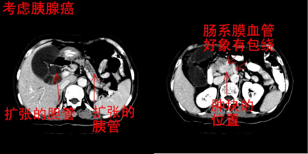 肝内外胆管及胆囊扩张,胰管扩张,但“双管征”不明显,胆总管下段内见软组织有强化影,肠系膜上静脉推移不是很明显,考虑胆总管下段癌可能大。