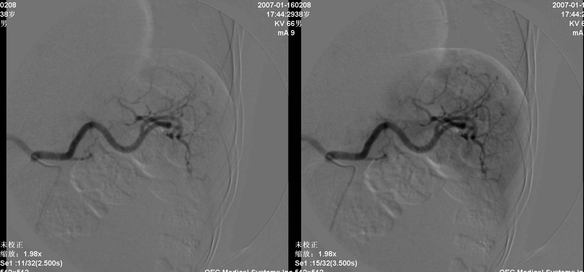 血管瘤的dsa诊断与ct诊断同一理论,但通常出现“枝头挂果征”象或“腊梅征象”,征象出现一般见于较大血管瘤,较大血管瘤也可出现动静脉短路(avs),此例血管瘤较小,“枝头挂果征”不明显。