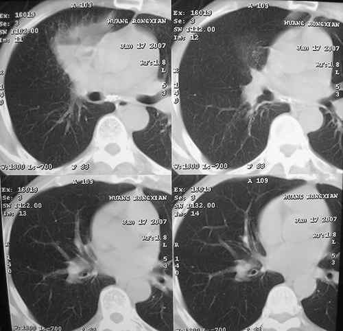 以下是引用dyqct在2007-1-18 22:22:00的发言:[br]右肺上叶前段见环形空洞样影,并见高位液平,内壁较光整,壁薄。纵隔未见肿大淋巴结,可见散在钙化灶。[br]考虑:1,肺脓肿;[br] 2,建议治疗后复查除外周围型肺癌。