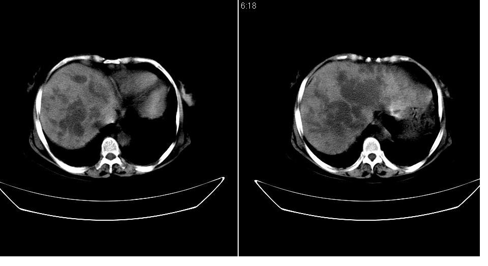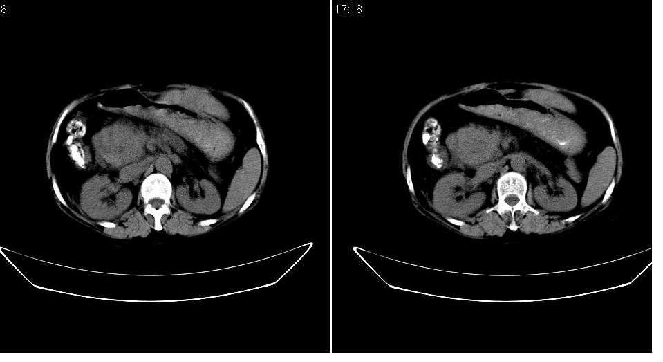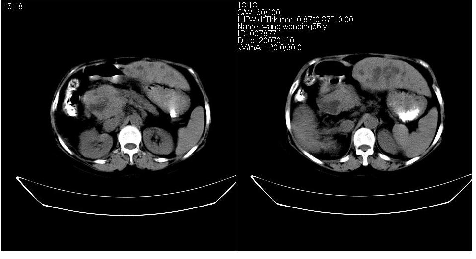 以下是引用守望可可西里在2007-1-20 23:09:00的发言:[br][br] 胰头癌,胆总管梗阻、截断,肝内外胆管重度扩张,肝内边缘部分的圆形低密度病灶多能与扩张的胆管较为连续,暂不考虑转移。病人没有黄疸吗?