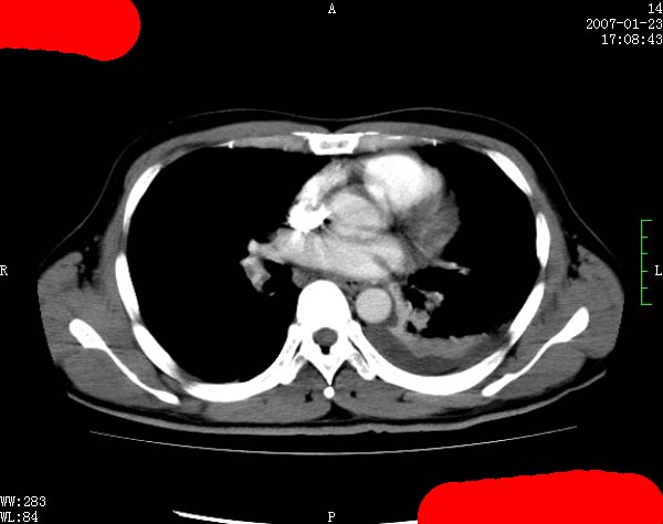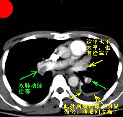 以下是引用jiangjing在2007-1-24 23:35:00的发言:[br]支持 增强扫描见右肺动脉干、左下肺动脉见充盈缺损。印象为:1、右肺动脉干、左下肺动脉栓塞。 2、左侧胸腔积液合并左肺下叶被动性肺不张。