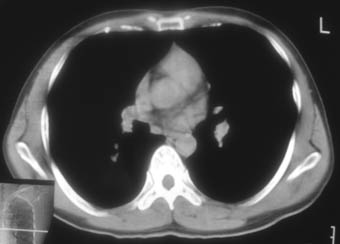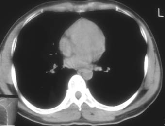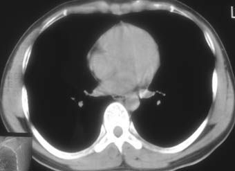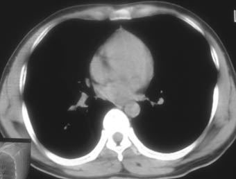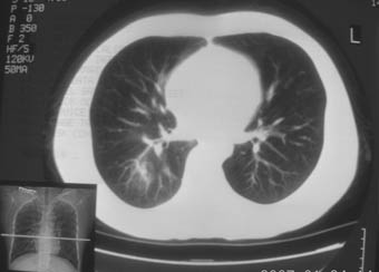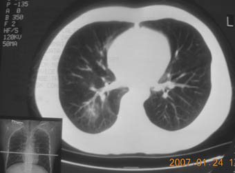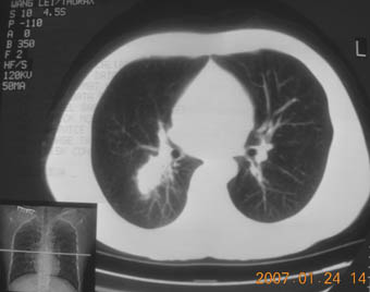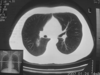 右肺下叶背段长椭圆型病灶,边缘较规则,无明显分叶征、毛刺,远段未见阻塞征象,病灶较松散,纵隔窗明显小于肺窗,年龄35岁,支气管稍示变窄,纵隔内未见明显肿大淋巴结,这些都不支持肿瘤。病人无任何感觉,无明显发热感冒病史,首先考虑结核(也是结核好发部位),慢性炎症不能完全除外。