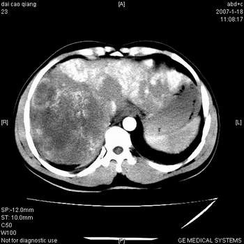 肝右叶巨块型肝癌破裂、门脉瘤栓形成。