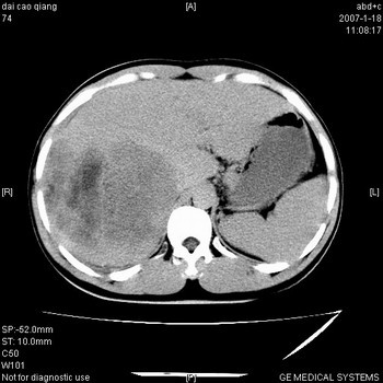 肝右叶巨大不均匀低密度肿块,前缘有假包膜,增强明显的呈快进快出表现,门脉右支有癌栓,病人虽然年轻但还是首先考虑肝右叶巨块形肝癌,病人血象高只能说有合并感染。不支持肝脓肿。