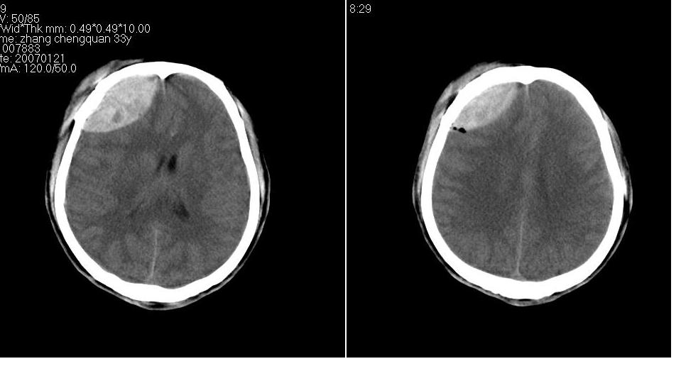 以下是引用dyqct在2007-1-25 17:57:00的发言:[br][quote]以下是引用卜一在2007-1-25 16:08:00的发言:[br]1 眼眶外侧壁 内侧壁 右侧筛窦 额骨鳞部_粉碎型骨折,并骨片植入眼眶内.[br]2 右侧额区硬膜外血肿伴积气.[br]3 眼眶内积气 筛窦内积血.