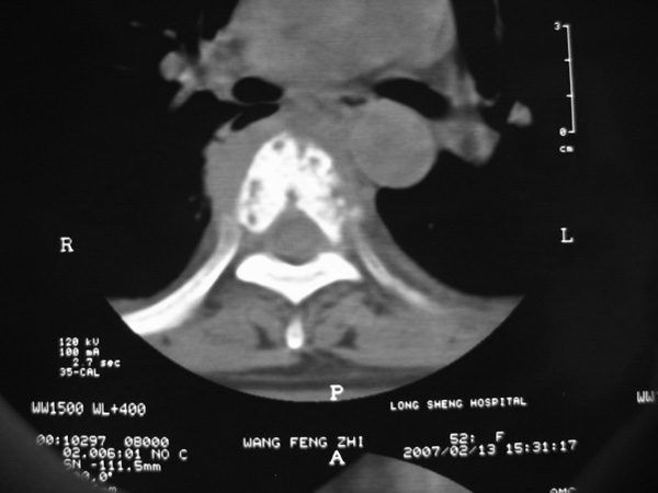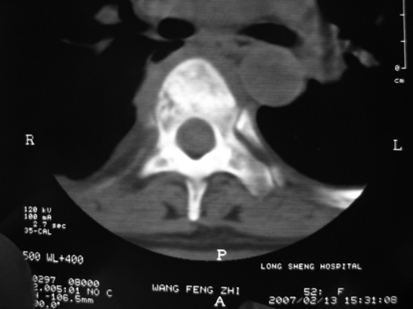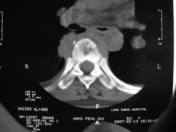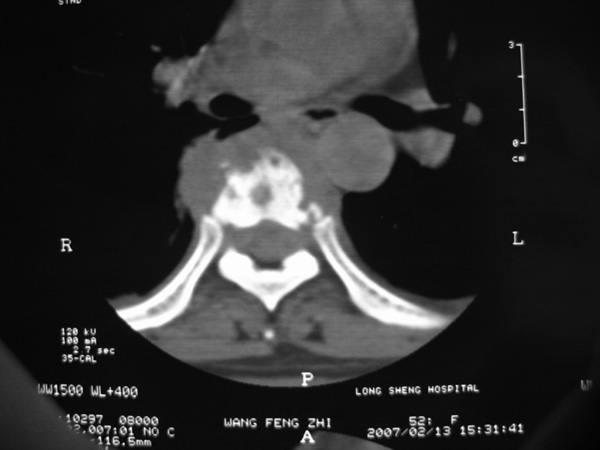 女,45岁,胸背部疼痛2个月。t6、7胸椎病变。