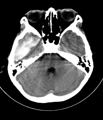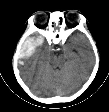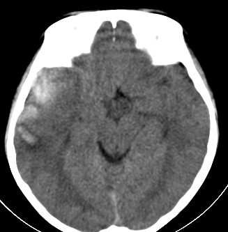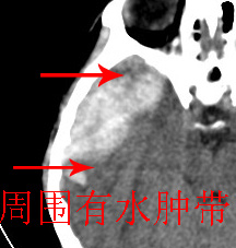 右侧颞叶大片状形态不规则高密度影,内缘较模糊,外缘紧贴颅板,无明显白质挤压移位伤。