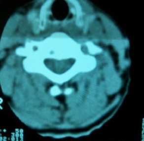颈椎右后缘见低密度影,无明显分隔,外周见硬化带,周围软组织未见异常,考虑许莫氏结节。