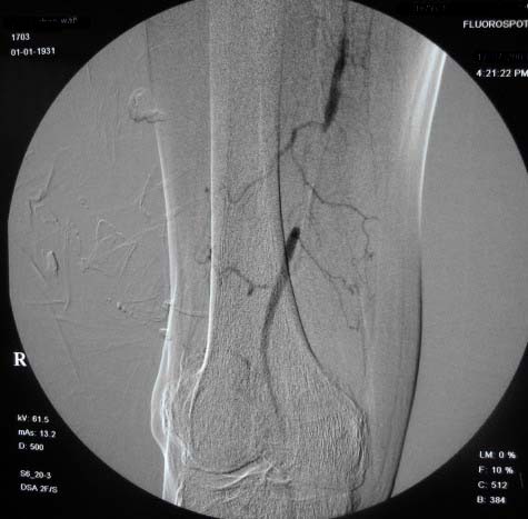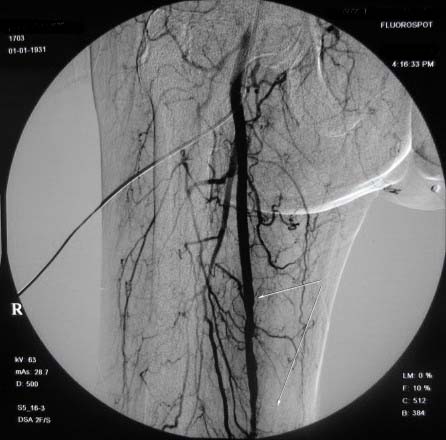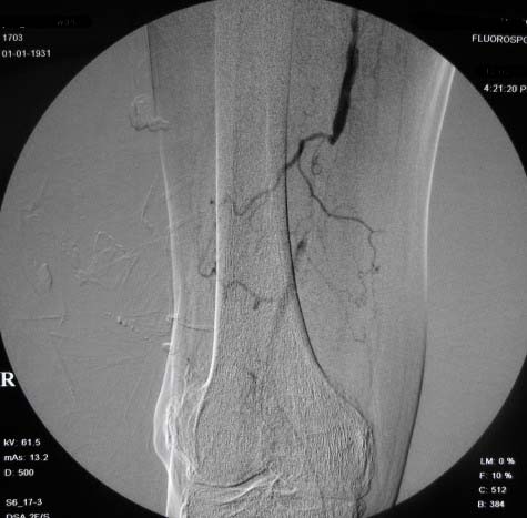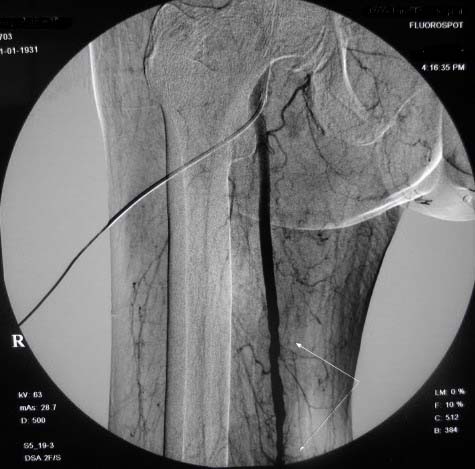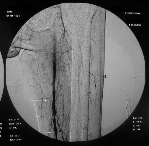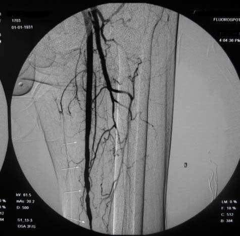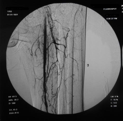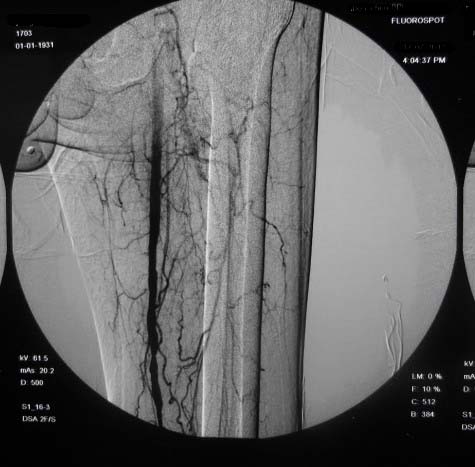 右侧股浅动脉上、中段多处狭窄,下段闭塞。左侧股浅动脉多处狭窄,国动脉起始部狭窄。可以用球囊扩张配合动脉内溶栓或股浅动脉支架置入。多为糖尿病所致。