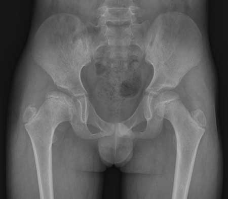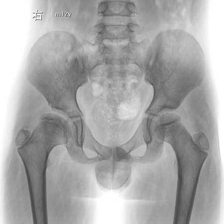 右侧髋臼股软骨病继发髋关节半脱位,本病好发于青少年,患者感到腿痛及跛行,运动后加重。