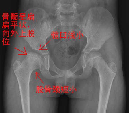 x线表现:1、髋臼浅而宽 2、股骨头骺变扁宽及囊变,干骺端亦有相应增宽 3、由于1所述,所以股骨头可向外上方移位。关节间隙下宽上窄不对称,呈半脱位状态。4、发病早,及时治疗可恢复正常、否则会遗留髋关节半脱位及继发骨性关节炎。本例表现经典,可以诊断。