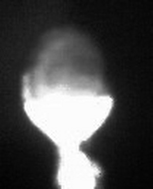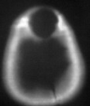 额骨垂直板上中部见椭圆形低密度区,边界清楚,硬化,膨胀,前方皮质断裂。