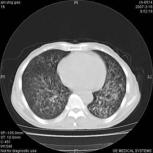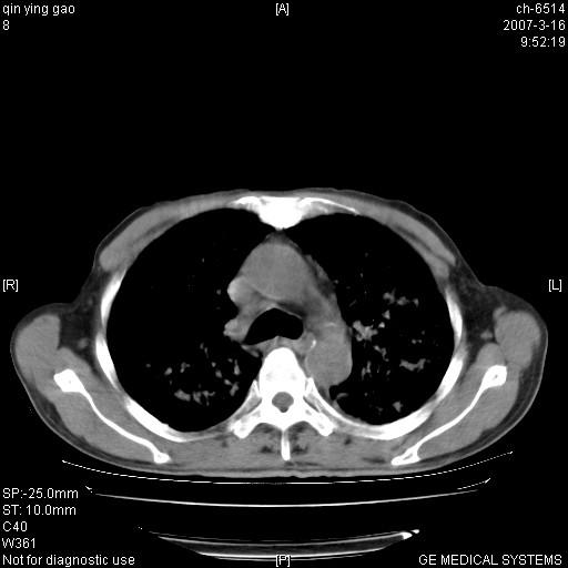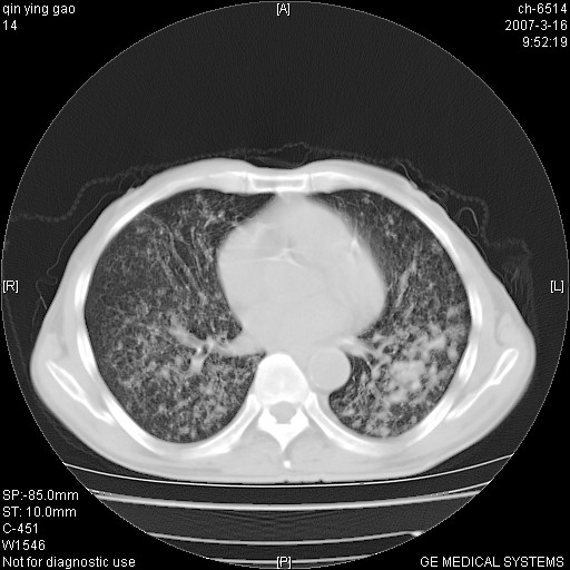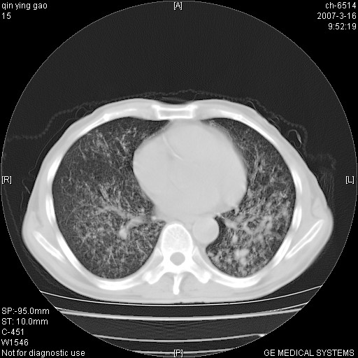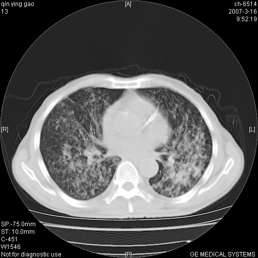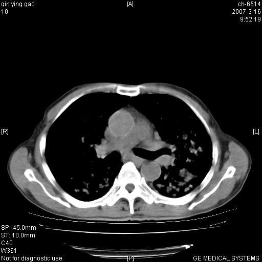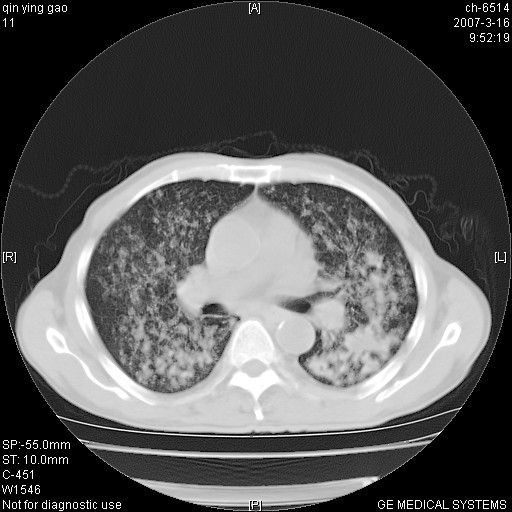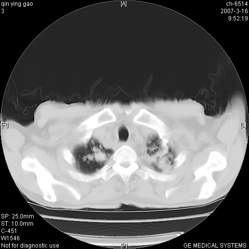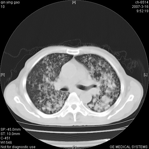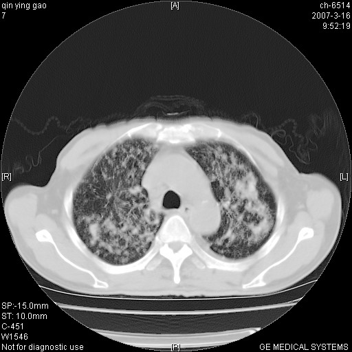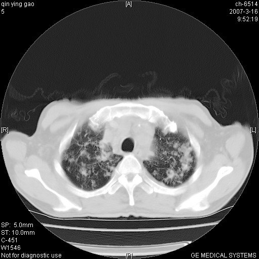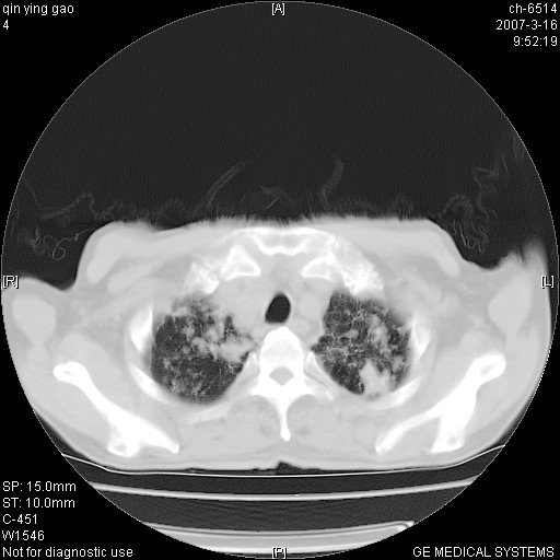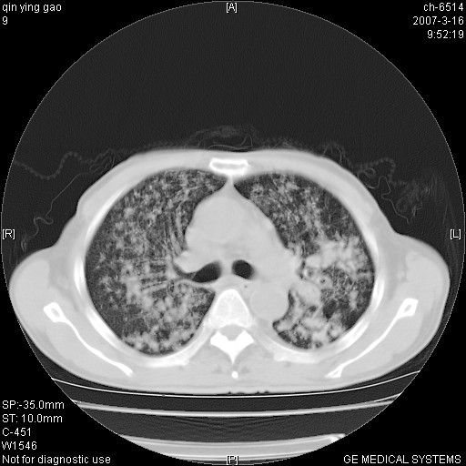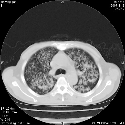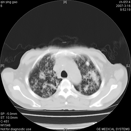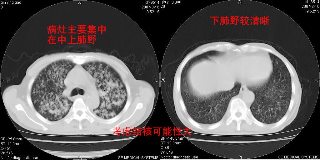 以下是引用zjzjr在2007-3-16 22:38:00的发言:[br]双肺可见大小不等结节状密度增高影,密度不均,分布不均(双肺上叶为著),亚急性血行播散性肺结核.