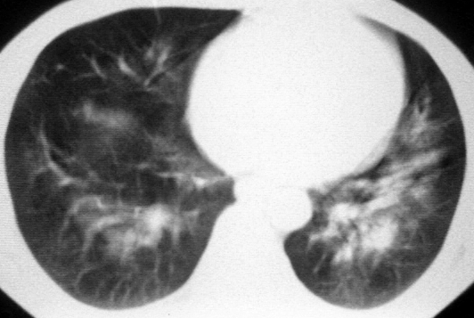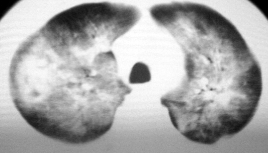 男,36岁,一月前醉酒淋雨后发热咳嗽,气短进行性加重.