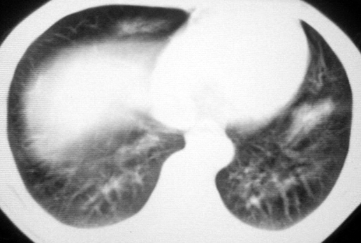 支持: 双肺内中部见略不对称性蝶翼状高密度区,边界不清,部分呈磨玻璃样密度,并可见含气支气管征。肺门、纵隔内未见肿大淋巴结影。无胸腔积液。