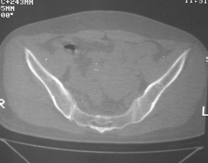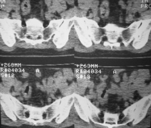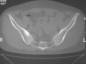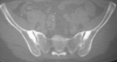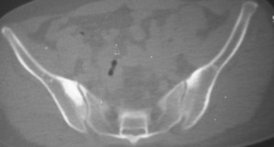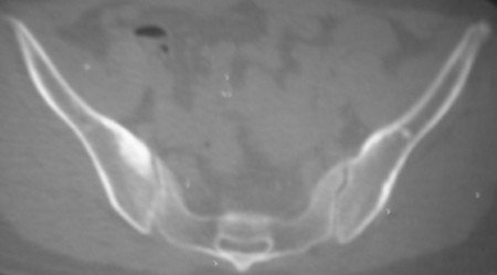 致密性骨炎,好发于骶髂关节的髂骨侧的耳状面(少见部位有骶骨,耻骨联合,甚至锁骨也有报道),好发于育龄期的妇女,多对称发病