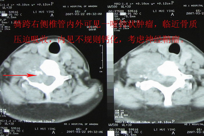 以下是引用卜一在2007-3-30 21:51:00的发言:[br]支持考虑:神经原性肿瘤。(右侧椎间孔扩大,椎板破坏,局部明显的软组织肿块,并与椎管 神经根关系密切。)