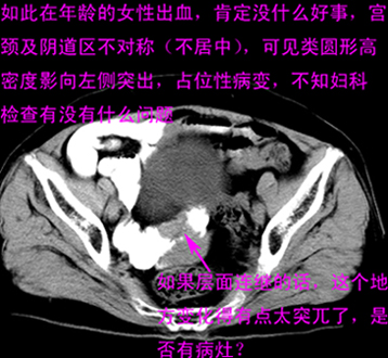1\\老年妇女突发阴道流血,常见病考虑宫颈癌.本病例宫颈部显示形态不规则,密度欠均匀,支持考虑宫 颈癌,建议mri 或阴道超声坚持