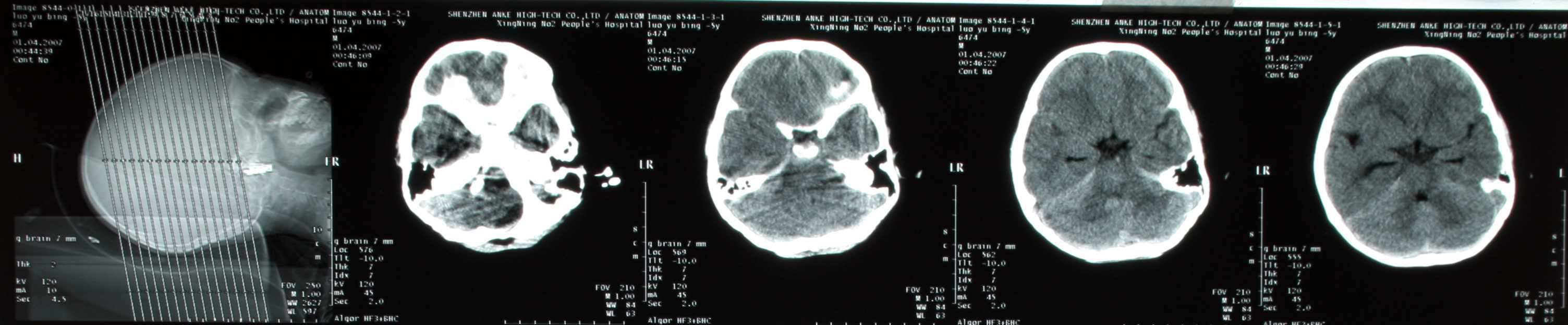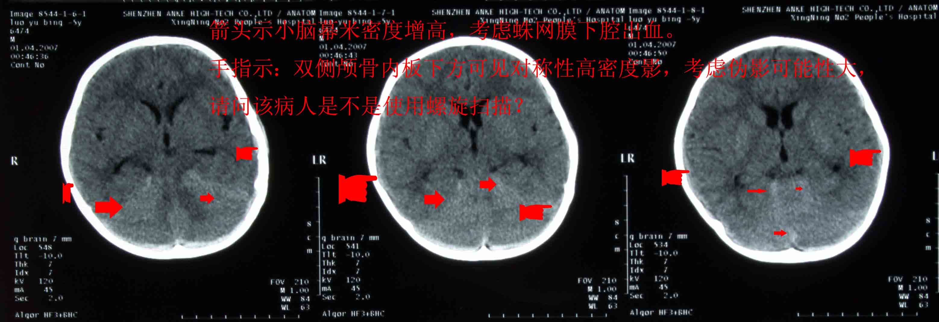 患儿,男,3周岁,半小时前不慎从床上摔下来,当时前额着地,后诉有点痛,伴呕吐二次,请各位老师会诊,患儿头颅有没有问题,后枕部颅下密度增高影,是伪影还是有出血,请指点: