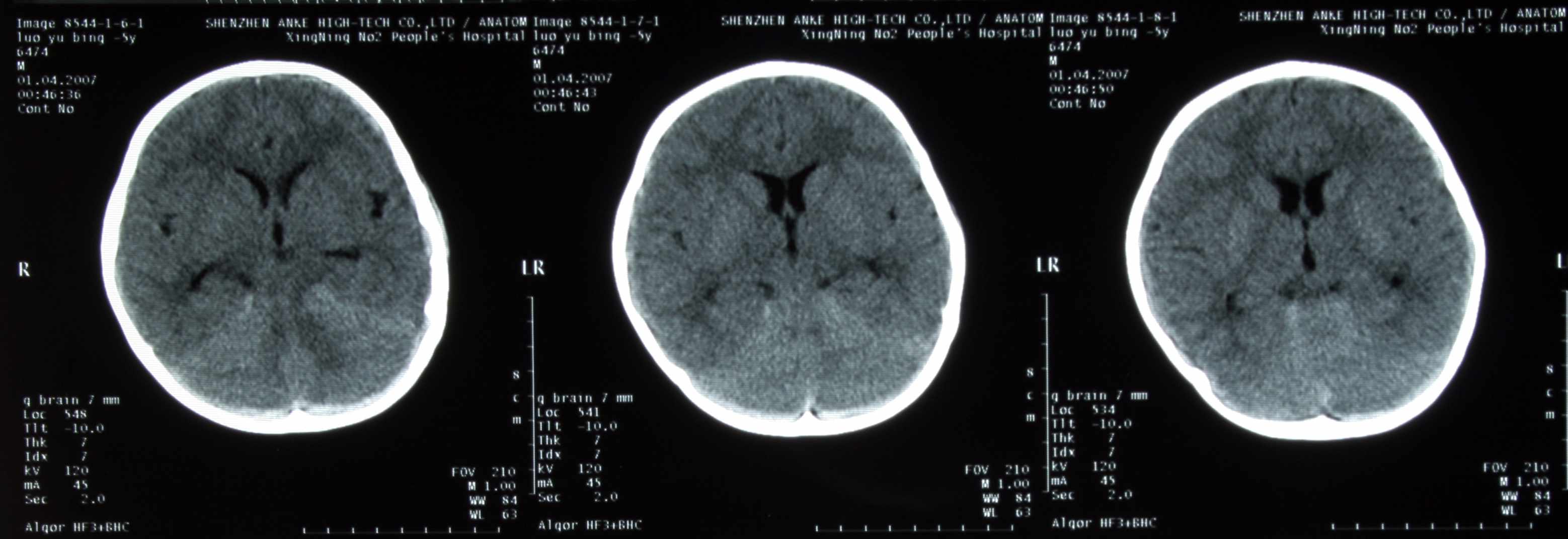 未见明显异常(脑灰白质分界清晰,脑池、脑室无扩张、变形、移位)。