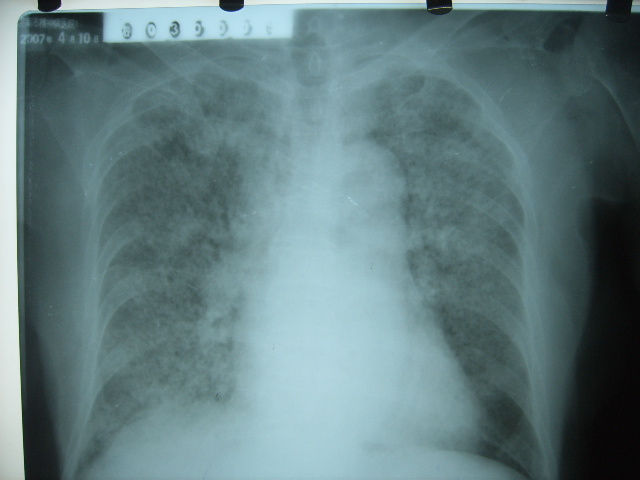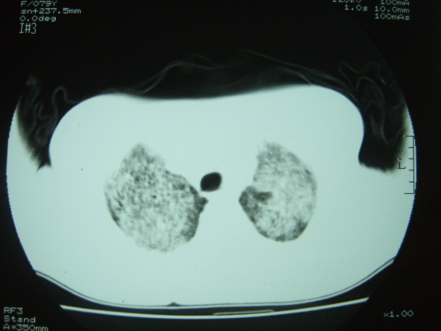 双肺弥漫小结节状高密度,部分融合,边界不清(因为不是hrct,可能为部分容积效应引起),肺门纵隔内未见肿大淋巴结影。无胸腔积液。