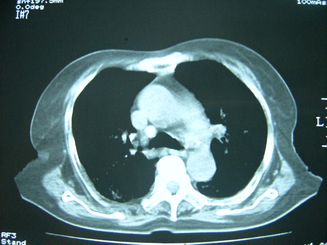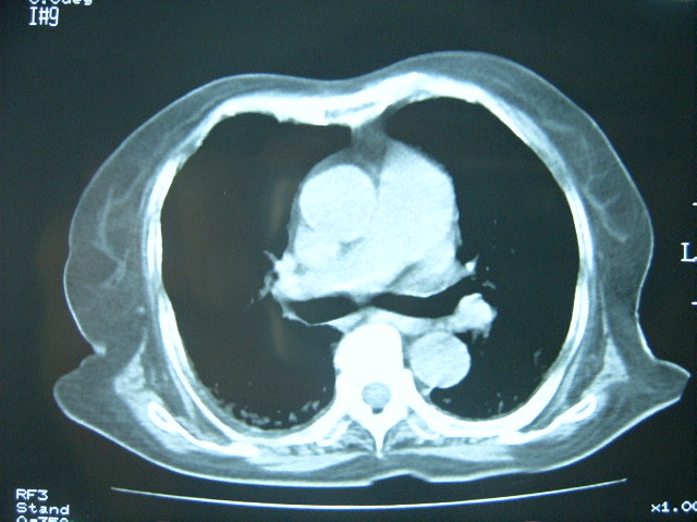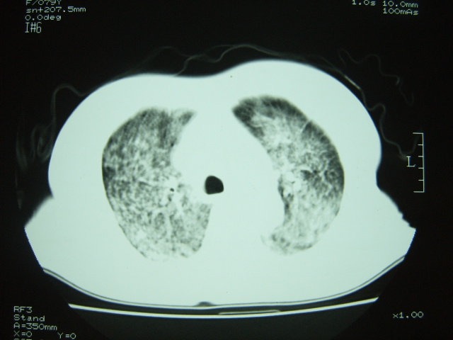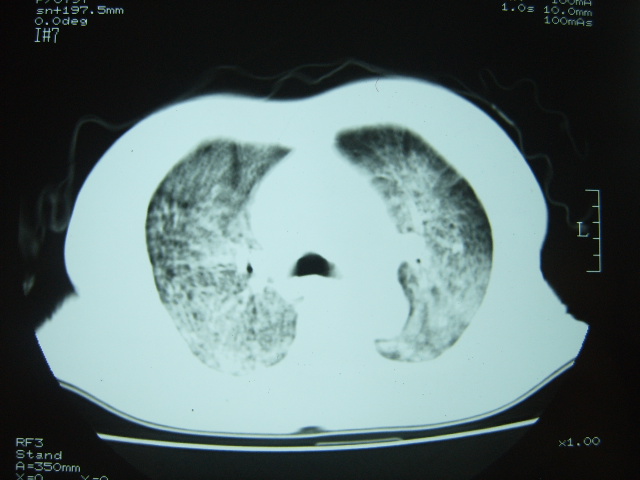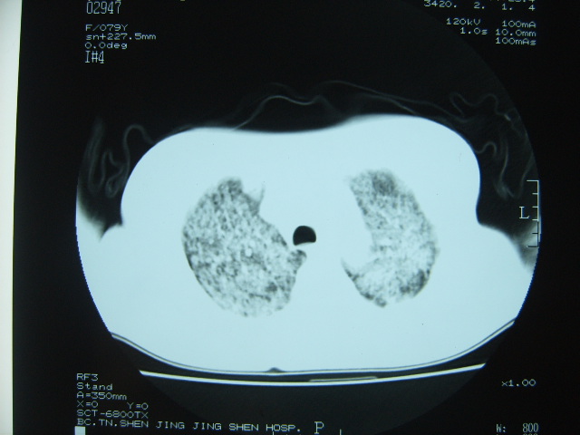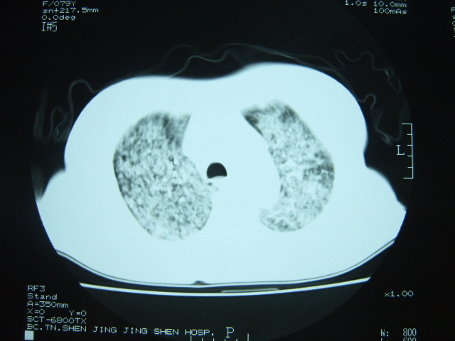 两肺弥漫分布之斑点状结节状影,除了血播外,应注意问一下是否有粉尘等病史.但纵隔窗不是很支持.