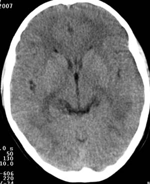 两侧脑室后角旁、丘脑、放射冠、颞顶叶呈对称性片状低密度影,脑室系统、环池、四叠体池、脑桥小脑角池偏大。