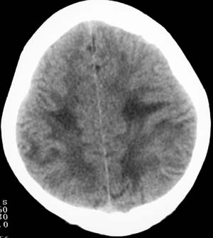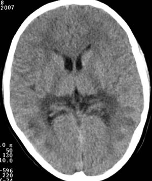 两侧脑室后角旁、丘脑、放射冠、颞顶叶呈对称性片状低密度影。