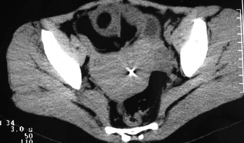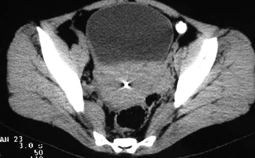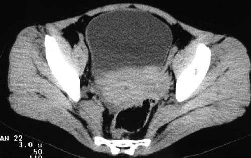 二、男,55岁,排尿困难两年,b超示盆腔不均质包块,ct值约27hu.