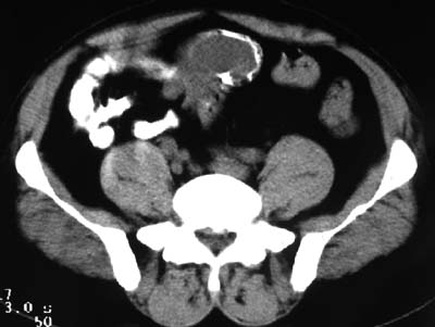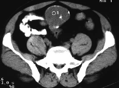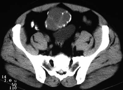 例2:盆腔占位,肿块密度欠均匀,其内有钙化影,其边界清晰,膀胱前上壁受压,膀胱壁尚清晰,考虑为不典型畸胎瘤压迫膀胱可能,建议增强扫描吧。