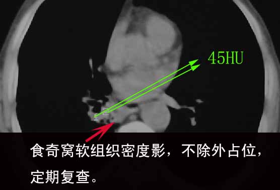 6、右侧肺门气食隐窝处似有不规则肿块,内密度不均,可以随访或纤支镜检查除外肿瘤。